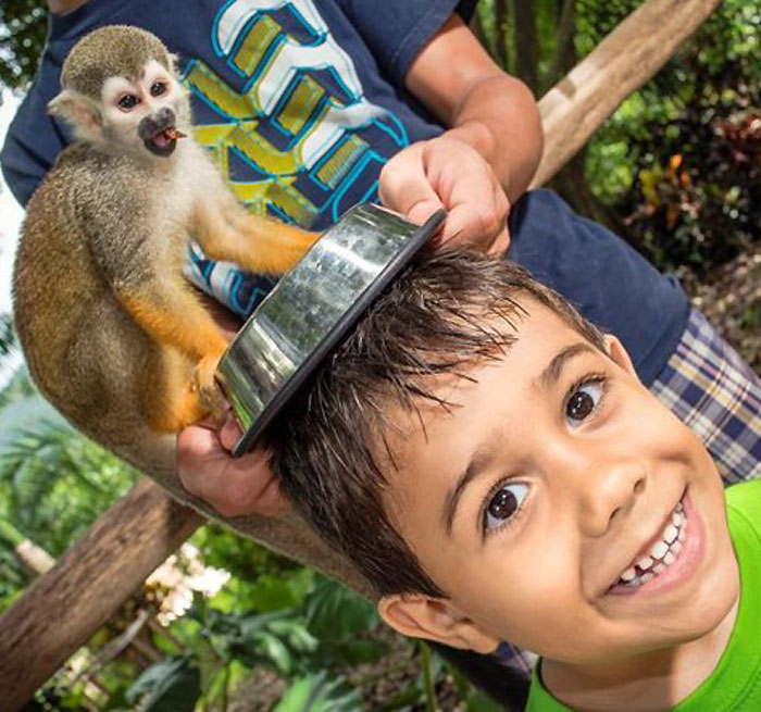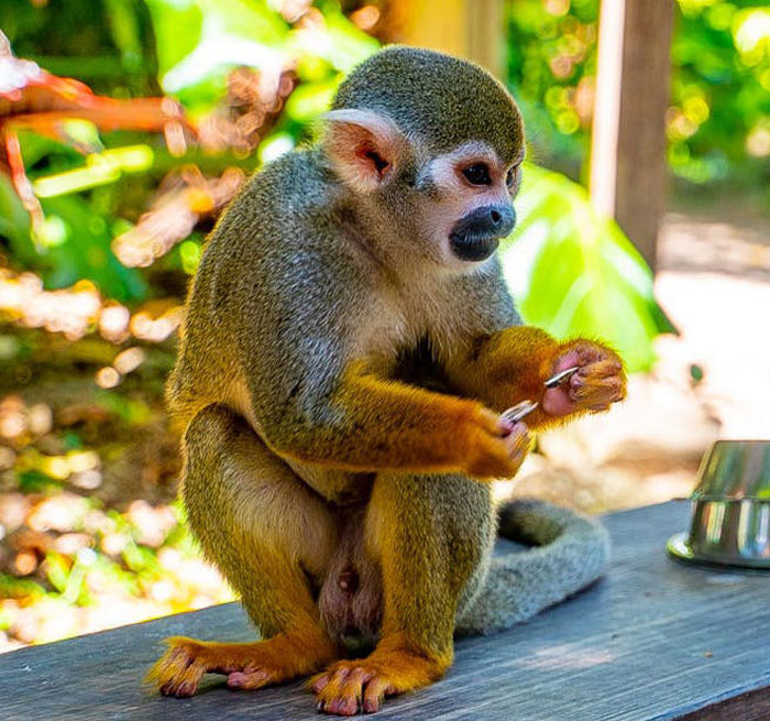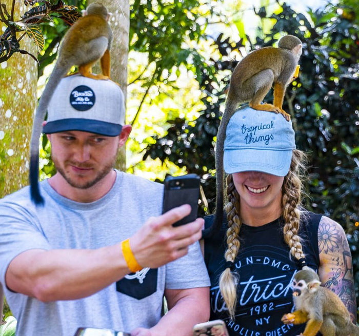 The monkeys are completely accustomed to human contact. They come down from the trees to sit on your shoulder and eat from your hands. Beware …. they love all things bright and interesting! Little monkeys love to pose for the cameras and probably will sit, and if allowed, see themselves in your camera. Adorable! Come share this unforgettable experience!