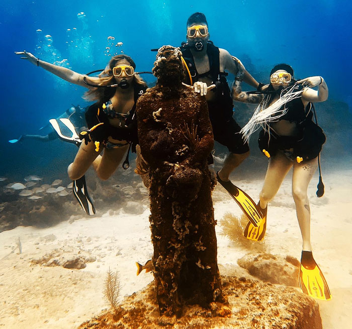 Pero eso no es todo: este buceo con doble tanque ofrece un giro único a tu experiencia de buceo: ¡una visita al famoso Museo Subacuático del Arte (M.U.S.A.) con más de 500 estatuas de artistas internacionales! Sumérgete en este famoso mundo submarino de Cancún.