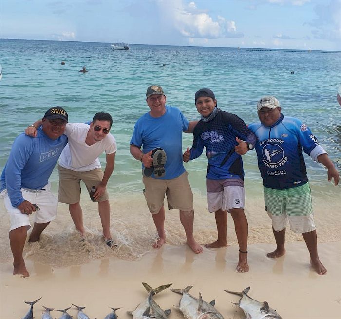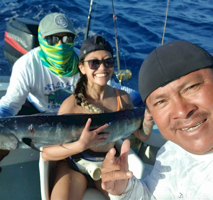 El capitán Salatiel Ku Caamal, vive en Playa del Carmen y tiene más de 22 años de experiencia en la pesca. El marinero Pedro es un joven pescador de 25 años que tiene 8 años de experiencia pescando con el capitán y es un gran guía de snorkel.