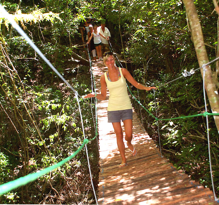 Si quieres puedes participar en nuestra ruta de la fruta. Te mostramos muchas frutas locales y te explicamos cómo vive la gente de la tierra aquí. Seguimos hasta el mirador, cruzando nuestro 'puente colgante' en el paseo.